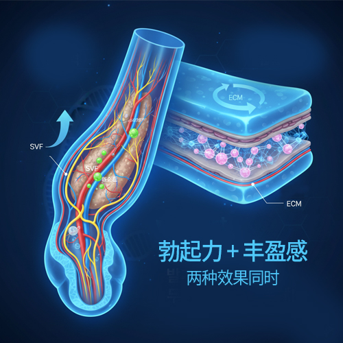 抽取自身脂肪,分别分离SVF(脂肪干细胞)和ECM(细胞外基质),注入海绵体和阴茎真皮,可同时实现勃起力和阴茎体积改善的再生治疗。