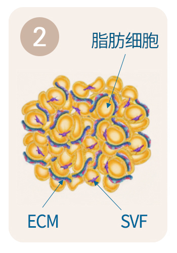 Smart SVF在腹部或所需部位局部麻醉下抽取自体脂肪组织后,结合机械分离法,提取SVF(基质血管级分)和ECM(细胞外基质)同时进样。